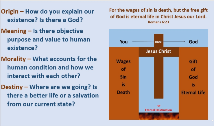 On the back of my business cards is an illustration of Romans 6:23, showing the cross as a bridge going from Death to Eternal Life. On the left of the card are several questions for conversation starters.