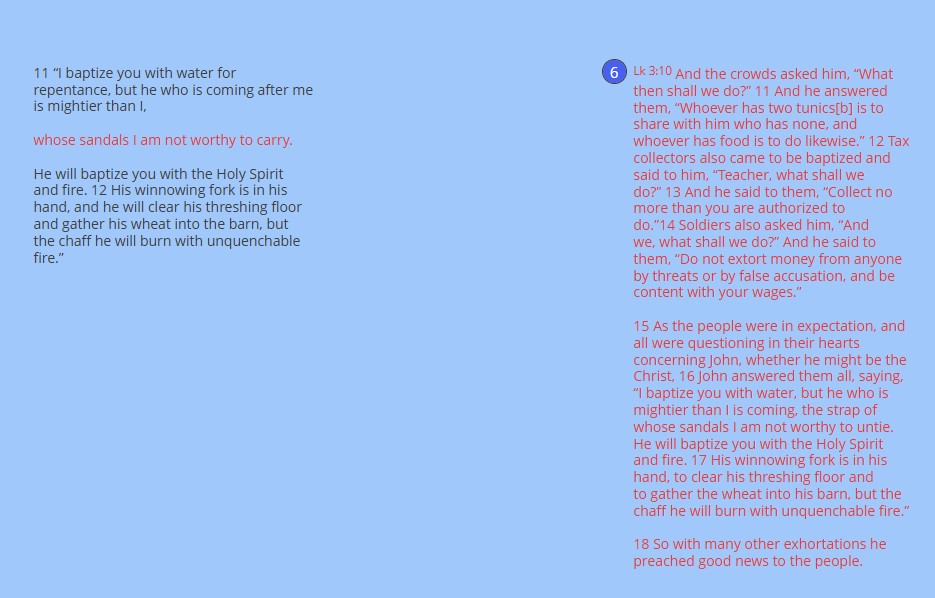 As we begin our study of this event, we notice something we haven’t encountered before. The narrative is developed from three gospels; in particular from Matthew 3:1 – 12, Mark 1:1 – 8, and Luke 3:1 – 18. With the help of the two photos shown below, we will see how the single narrative is developed.