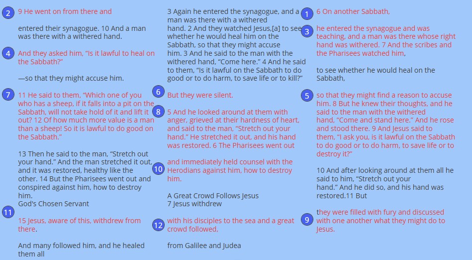 Lk 6:6 On another Sabbath, Mt 12:9 [Jesus] went on from there and Lk 6:6 he entered the synagogue and was teaching, and a man was there whose right hand was withered. 7 And the scribes and the Pharisees watched him, Mt 12:10 and they asked him, “Is it lawful to heal on the Sabbath?” Lk 6:7 so that they might find a reason to accuse him.