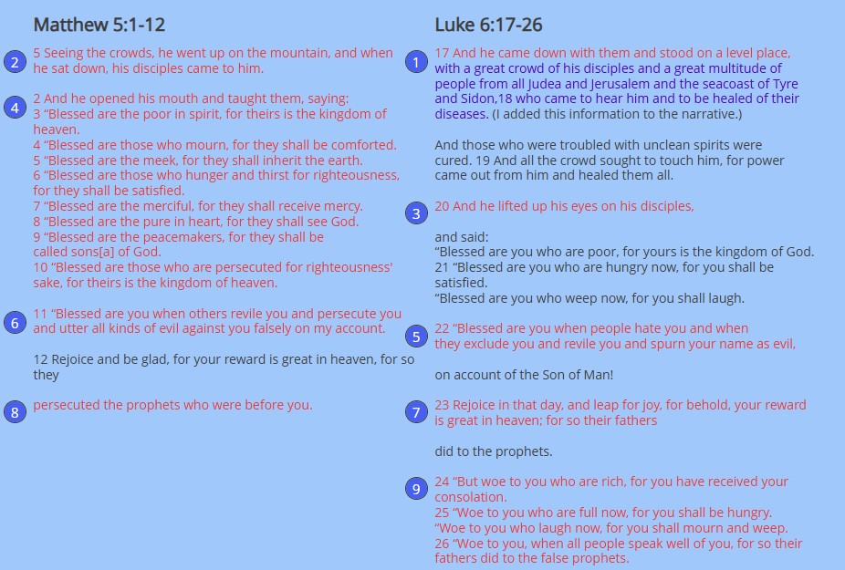 Lk 6:17 And [Jesus] came down with them and stood on a level place, with a great crowd of his disciples and a great multitude of people from all Judea and Jerusalem and the seacoast of Tyre and Sidon, 18 who came to hear him and to be healed of their diseases [and] Mt 5:1 seeing the crowds, he went up on the mountain, and when he sat down, his disciples came to him. Lk 6:20 And he lifted up his eyes on his disciples, Mt 5:2 he opened his mouth and taught them, saying: