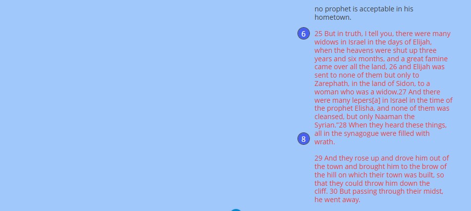 Lk 4:25 [Jesus continued,] “But in truth, I tell you, there were many widows in Israel in the days of Elijah, when the heavens were shut up three years and six months, and a great famine came over all the land, 26 and Elijah was sent to none of them but only to Zarephath, in the land of Sidon, to a woman who was a widow.27 And there were many lepers in Israel in the time of the prophet Elisha, and none of them was cleansed, but only Naaman the Syrian.”