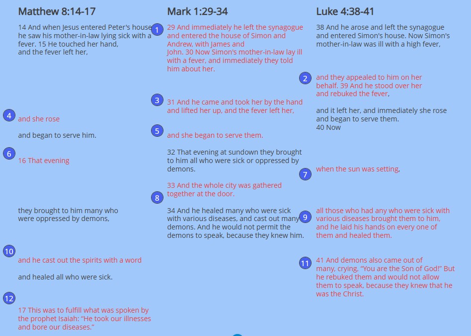 Mk 1:29 [As soon as] he left the synagogue [he went] and entered the house of Simon and Andrew, with James and John. 30 Now Simon’s mother-in-law lay ill with a fever, and immediately they told him about her, Lk 4:38 and they appealed to him on her behalf, 39 and he [came and] stood over her and rebuked the fever, Mk 1:31 and he took her by the hand and lifted her up and the fever left her. Mt 8:15 Immediately she [got up] Mk 1:31 and she began to serve them.