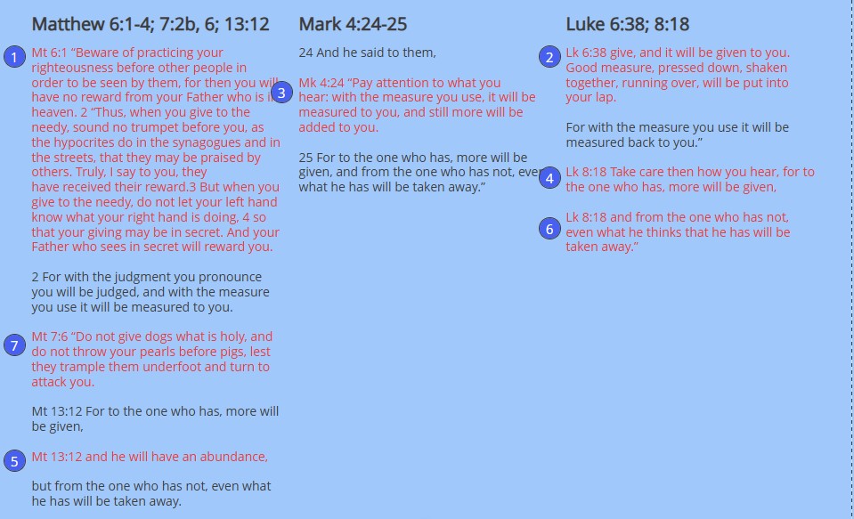 Scripture Reference: Matthew 6:1-4; 7:2b, 6; 13:12; Mark 4:24-25; Luke 6:38; 8:18
