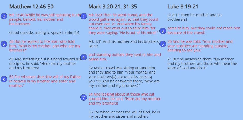Mt 12:46 While he was still speaking to the people, behold, his mother and his brothers’ Lk 8:19 came to him, but they could not reach him because of the crowd, Mk 3:31 and standing outside they sent to him and called him.