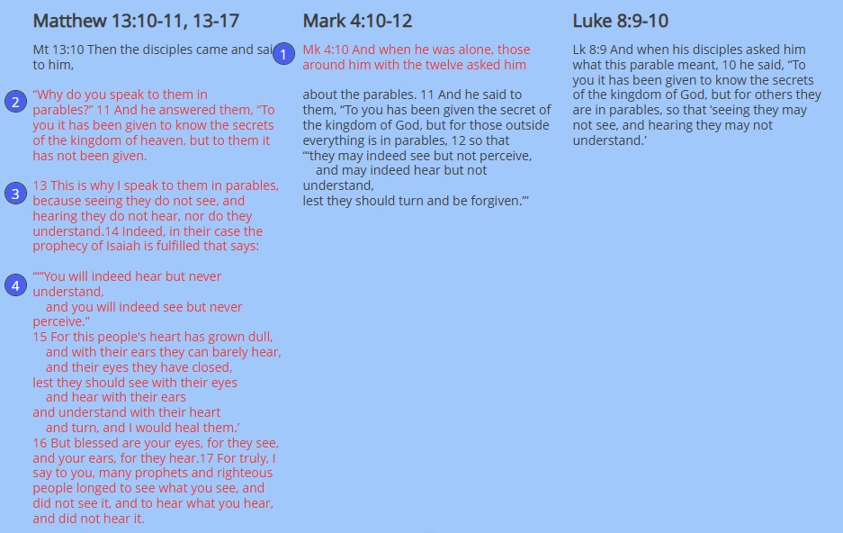 Passages: Matthew 13:10–11, 13–17; Mark 4:10–12; Luke 8:9–10