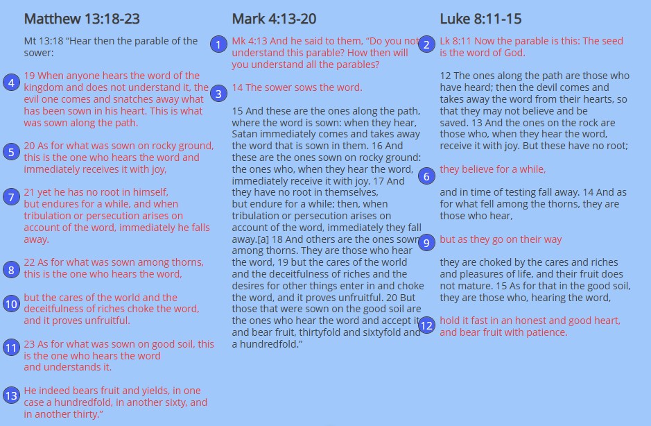 Matthew 13:18–23, Mark 4:13–20, and Luke 8:11–15 present Jesus’ direct explanation of the Parable of the Sower, given privately to His disciples after the crowds heard the story. In the broader context, Jesus has begun teaching in parables as a form of both revelation and judgment, revealing truth to those who are receptive while concealing it from those whose hearts are hardened (as seen in the preceding verses). When the disciples ask for understanding, Jesus emphasizes that this parable is foundational; understanding it becomes a key to grasping many of His other teachings about the kingdom of God. The “seed” is identified as the Word of God, and the various types of soil represent the differing conditions of the human heart in response to that Word. The hard path symbolizes those who hear but do not understand, allowing Satan to quickly remove the truth before it takes root. The rocky ground reflects those who receive the Word with initial joy but fall away under pressure, persecution, or hardship because their faith lacks depth. The thorny soil describes those whose spiritual growth is choked by worldly cares, the deceitfulness of riches, and competing desires. Finally, the good soil represents those who hear, understand, receive, and persevere in the Word, bearing fruit with patience and endurance. Together, these passages emphasize that the effectiveness of God’s Word is not diminished; rather, the determining factor is the condition and response of the hearer’s heart, calling for self-examination and a steadfast, fruitful faith.