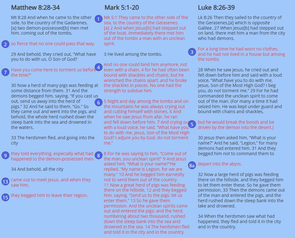(5) The demons acknowledge Jesus as the Son of God and his authority over them. This serves as a powerful affirmation of his divine nature, even in a Gentile region far from Jewish religious centers. Jesus’ authority and mission are universal, extending beyond cultural and geographic boundaries to bring freedom and restoration to all people. (On the above worksheet see circle 17)