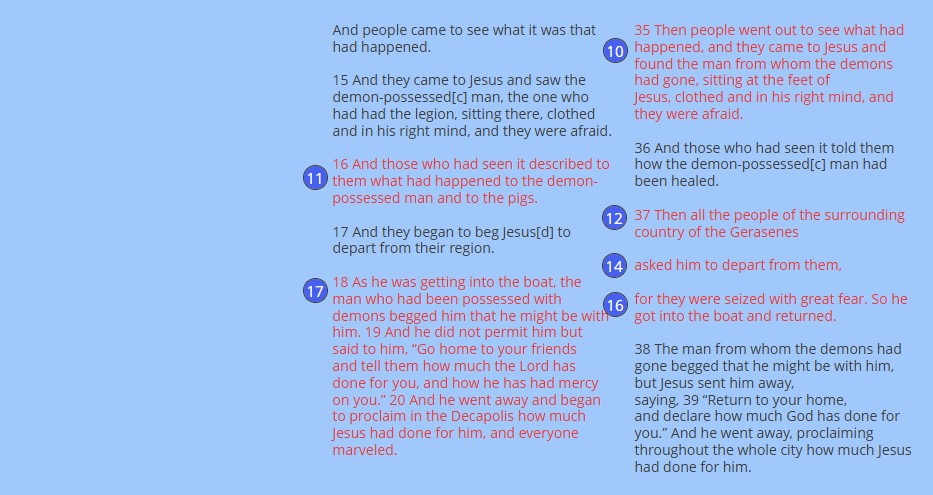 (3) The townspeople, upon seeing the man healed and hearing about the drowned pigs, respond with fear and ask Jesus to leave their region. Their reaction reveals a focus on the economic loss (the pigs) rather than the miracle of the man’s transformation. The presence of Jesus can be disruptive, challenging priorities and revealing misplaced values. Some may resist his transformative power when it disrupts their comfort or material concerns. (On the above worksheet see circles 11 – 16)