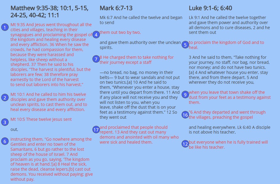 Mt 10:1 And he called to him his twelve disciples and gave them authority over unclean spirits, to cast them out, and to heal every disease and every affliction. Mt 10:5 These twelve Jesus sent Mk 6:7 out two by two, Lk 9:2 to proclaim the kingdom of God and to heal.