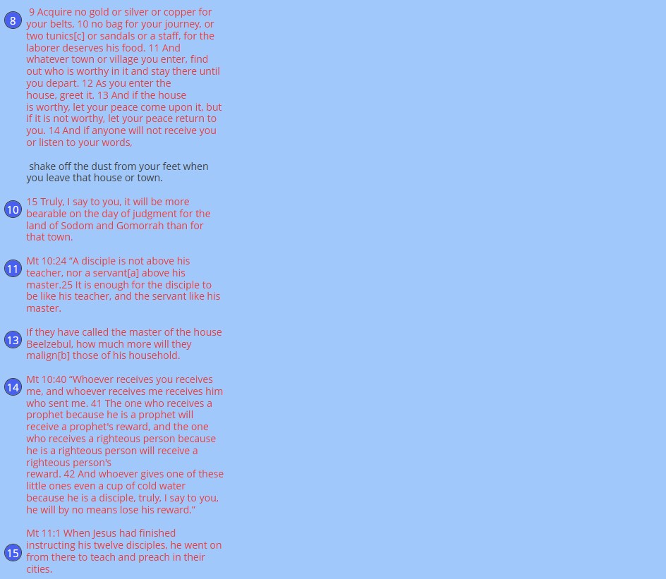 (3) Jesus instructs the disciples to travel lightly, taking no extra provisions, and to rely on the hospitality of those who receive them. If a town rejects them, they are to shake the dust off their feet as a testimony against it. (On the above worksheet see circles 6 – 10) Trusting God for provision is central to the mission. Disciples are called to live simply and focus on the task of proclaiming the kingdom, relying on God and the generosity of others.