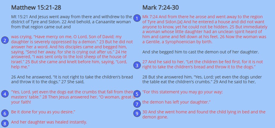 Mt 15:28 Then Jesus answered her, “O woman, great is your faith! Mk 7:29 For this statement you may go your way. Mt 15:28 Be it done for you as you desire. Mk 7:29 The demon has left your daughter.”